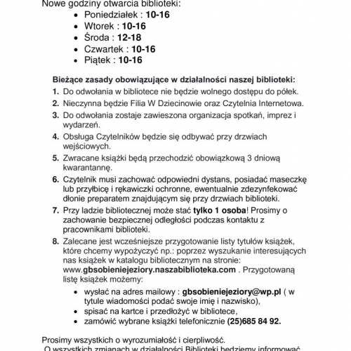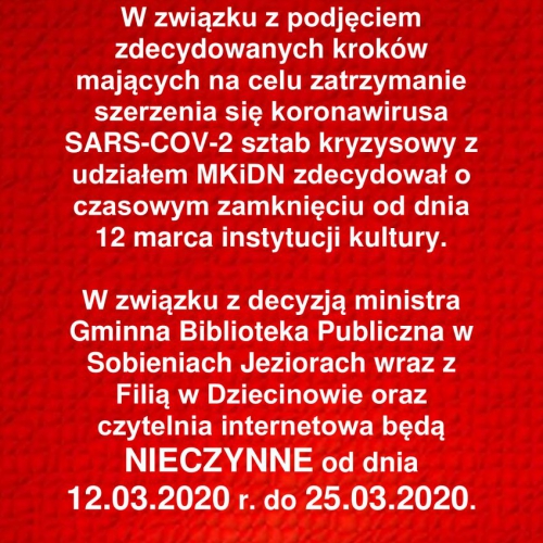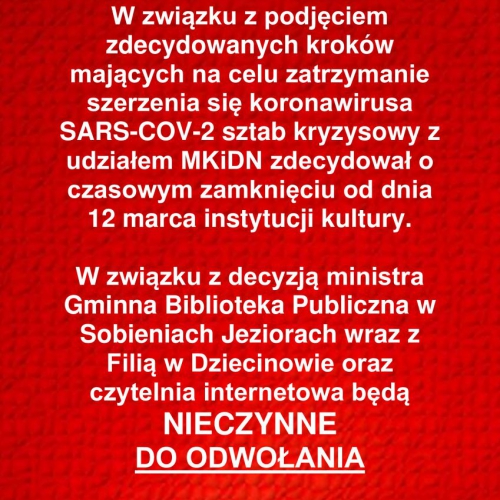 UWAGA! Szanowni Czytelnicy, Gminna Biblioteka Publiczna w Sobieniach-Jeziorach oraz Fiflia w Dziecinowie wciąż pozostają zamknięte do odwołania. O wszelkich zmianach będziemy informować na bieżąco na Facebook i na naszej stronie internetowej.
