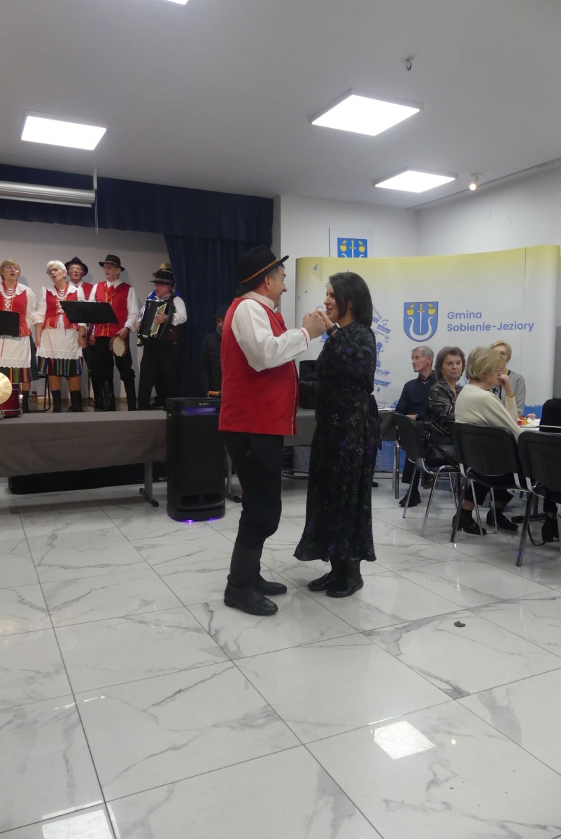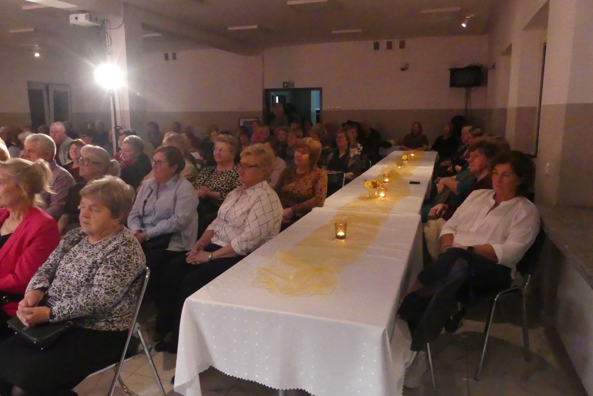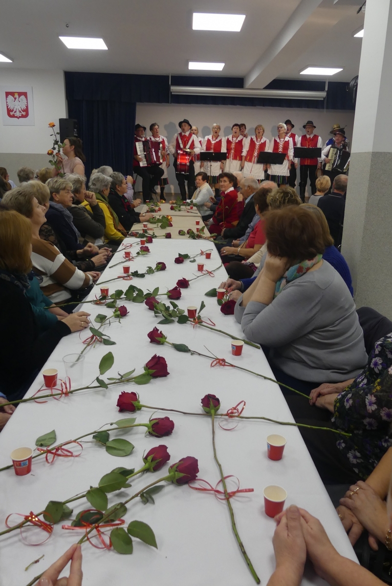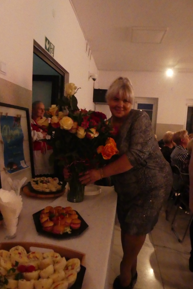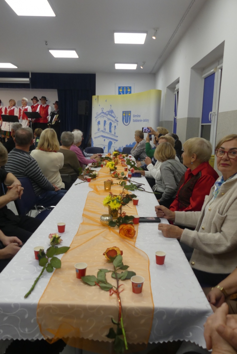 Wieczór rozpoczęła życzeniami pani Edyta Rosłaniec - Sekretarz GMINA Sobienie-Jeziory oraz nasza P.O. Dyrektora pani Paulina Szymańska. Chwilę potem na scenę wyszedł kabaret "Czy Jakoś Tak", który bawił publiczność ponad godzinę. Po widowisku przy gromkim "Sto lat!" wznieśliśmy toast za zdrowie Seniorów. Każdy gość dostał także piękną różę.
