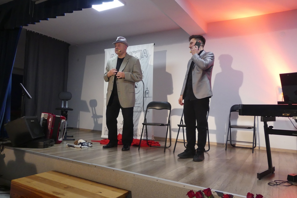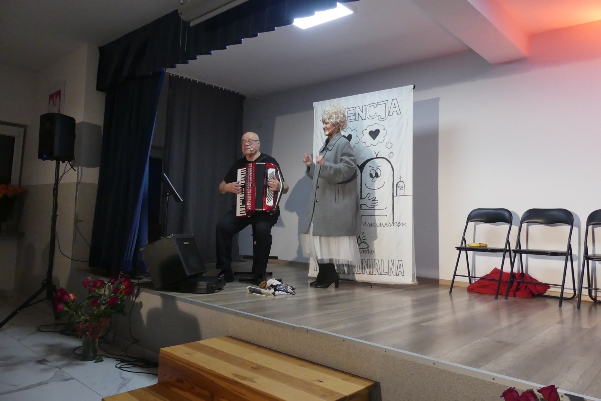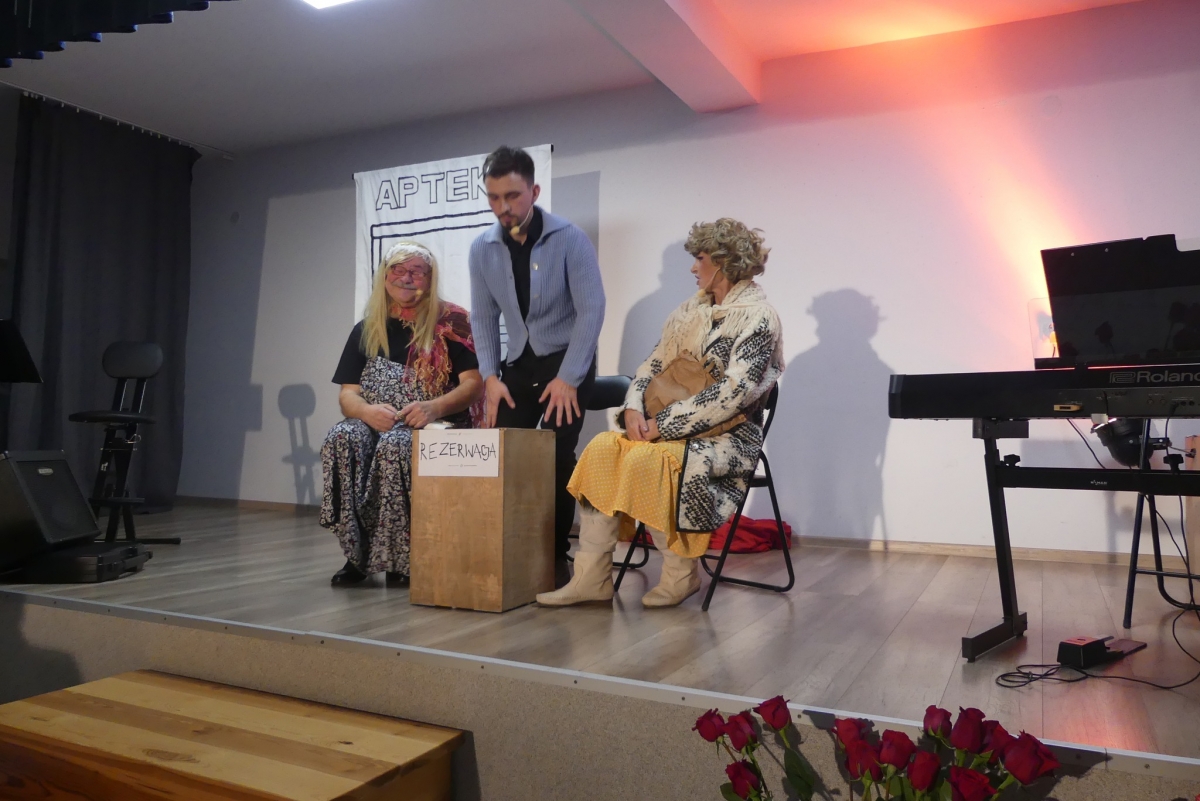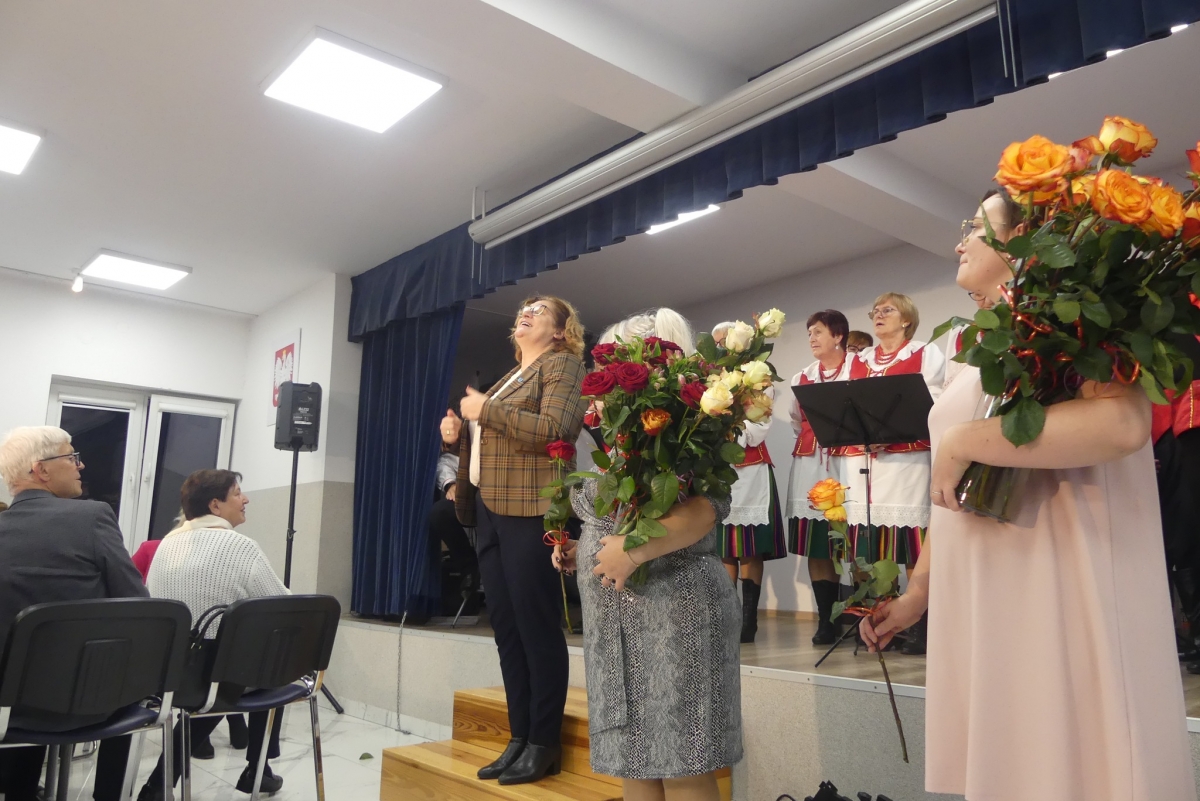 Wieczór rozpoczęła życzeniami pani Edyta Rosłaniec - Sekretarz GMINA Sobienie-Jeziory oraz nasza P.O. Dyrektora pani Paulina Szymańska. Chwilę potem na scenę wyszedł kabaret "Czy Jakoś Tak", który bawił publiczność ponad godzinę. Po widowisku przy gromkim "Sto lat!" wznieśliśmy toast za zdrowie Seniorów. Każdy gość dostał także piękną różę.