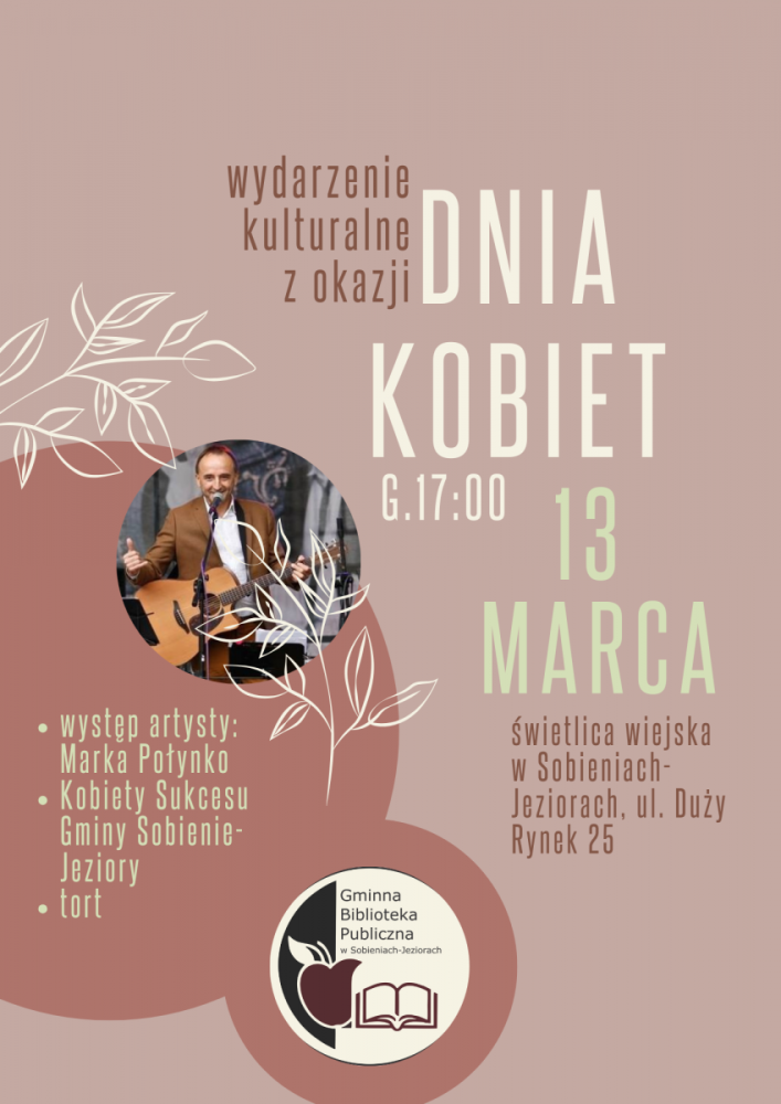 Wszystkie Panie - w każdym wieku - zapraszamy na wydarzenie kulturalne z okazji Dnia Kobiet, które odbędzie się w piątek 13 marca 2026 r. w świetlicy wiejskiej w Sobieniach-Jeziorach, ul. Duży Rynek 25 o godz. 17:00.