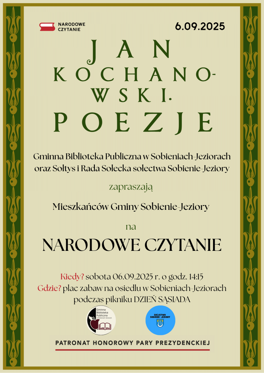 Wraz z Sołtys i Radą Sołecką sołectwa Sobienie-Jeziory zapraszamy serdecznie Mieszkańców Gminy Sobienie-Jeziory na Narodowe Czytanie.