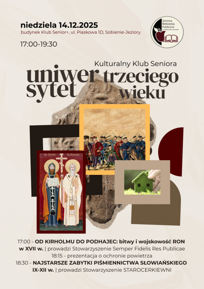 Zapraszamy w niedzielę 14.12.2025 r. od godz. 17:00 do 19:30 do budynku Klub Senior+, ul. Piaskowa 1D, Sobienie-Jeziory na 2 ciekawe wykłady historyczne i prezentacje o ochronie powietrza.